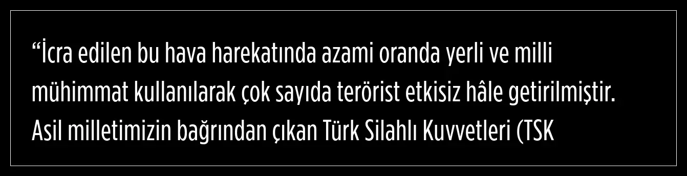 , geçmişte olduğu gibi bugün de ülkemizin ve milletimizin beka ve güvenliği için terörle mücadeleye son terörist etkisiz hale getirilinceye kadar azim ve kararlılıkla devam edecektir. Bu harekat sırasında; masum insanların, dost unsurların, tarihî ve kültürel varlıklar ile çevrenin zarar görmemesi için her türlü tedbir alınmıştır.”)
