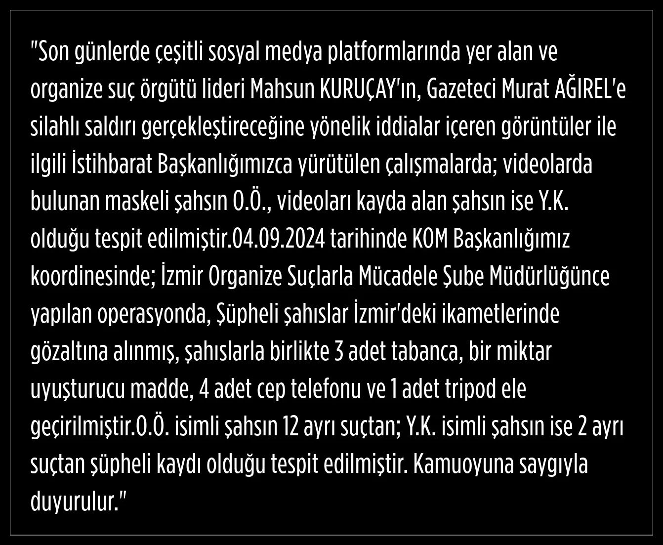 Emniyet Genel Müdürlüğü, Murat Ağırel’i tehdit eden şahsın gözaltına alındığına ilişkin sosyal medyadan bir açıklama yaptı.