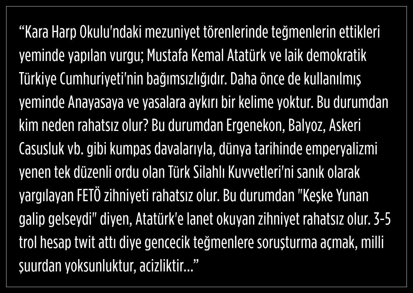 Ancak, Kara Harp Okulu’nun 30 Ağustos'ta gerçekleştirilen mezuniyet töreni sonrası sosyal medyaya yayılan, genç teğmenlerin gayrı resmi yemini ve “Mustafa Kemal’in askerleriyiz” sözleri tartışma yarattı.