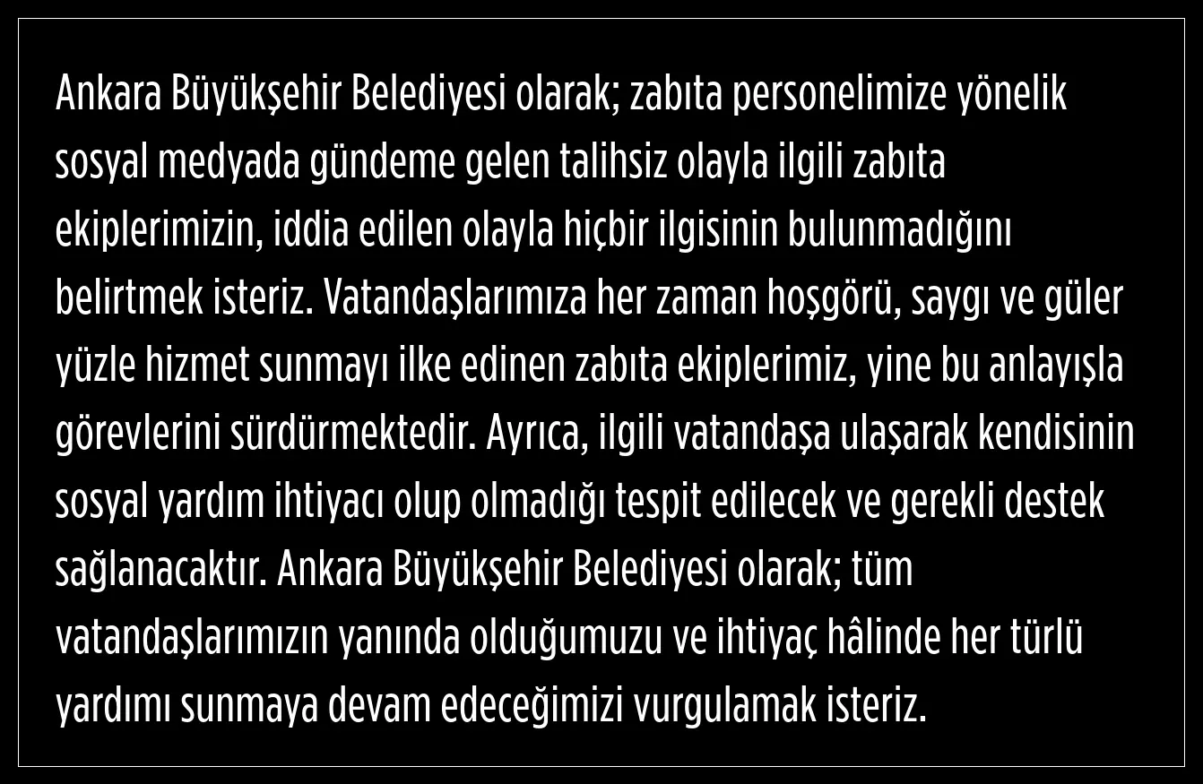 Ankara Büyükşehir Belediyesi, zabıta ekiplerinin iddia edilen olayla hiçbir ilgisinin bulunmadığını ifade etti.