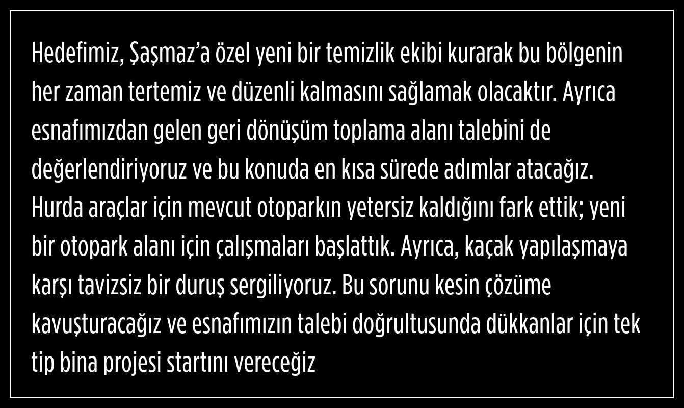 Şaşmaz'ın her anlamda gelişmesi, esnafın taleplerinin karşılanması ve bu bölgenin hak ettiği değeri görmesi için var gücüyle çalışacaklarını belirten Etimesgut Belediye Başkanı Erdal Beşikcioğlu, "Şaşmaz’ı daha temiz, düzenli ve modern bir sanayi sitesi haline getirmek için aralıksız olarak çalışmalarımıza devam edeceğiz" dedi.