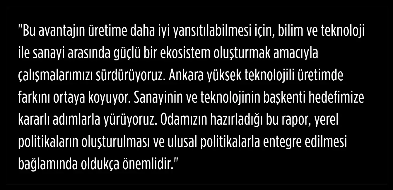 Raporda, teknoloji sınıflandırması üzerinden yapılan analizler, Ankara'nın yüksek teknoloji ihracatında, yüzde 13'lük payla Türkiye ortalaması olan yüzde 3,1’in üzerinde yer aldığını gösterdi. Ankara, diğer sanayi şehirlerine kıyasla yüksek teknoloji ihracatında en yüksek orana sahip şehir oldu.