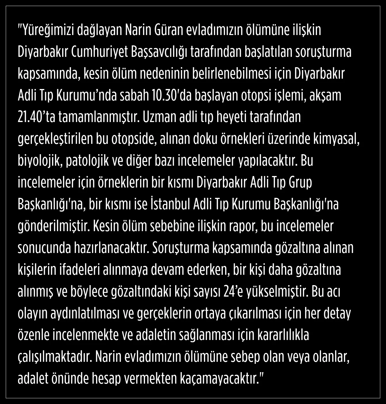 Merkez Bağlar ilçesine bağlı Tavşantepe Mahallesi'nde 21 Ağustos'ta kaybolan ve bugün cansız bedeni bulunan Narin Güran'ın ölümüne ilişkin Diyarbakır Cumhuriyet Başsavcılığı tarafından başlatılan soruşturma devam ediyor.