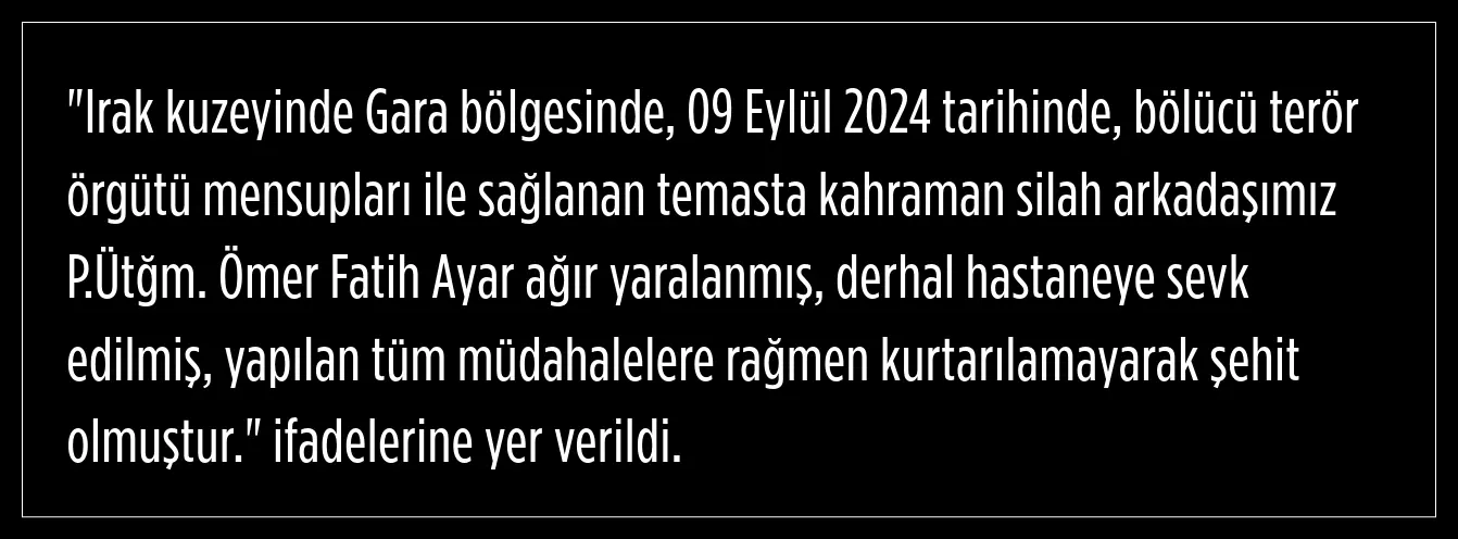Milli Savunma Bakanlığı, Irak'ın kuzeyindeki Gara bölgesinde bölücü terör örgütü mensupları ile sağlanan temasta ağır yaralanan Piyade Üsteğmen Ömer Fatih Ayar'ın şehit olduğunu duyurdu.