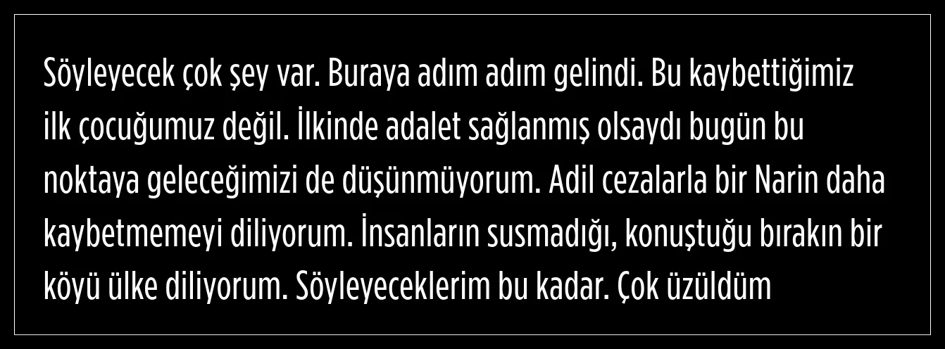 Tüm Türkiye, Narin'i kimin öldürdüğünün bulunmasını ve hak ettiği cezayı almasını ümitle bekliyor.