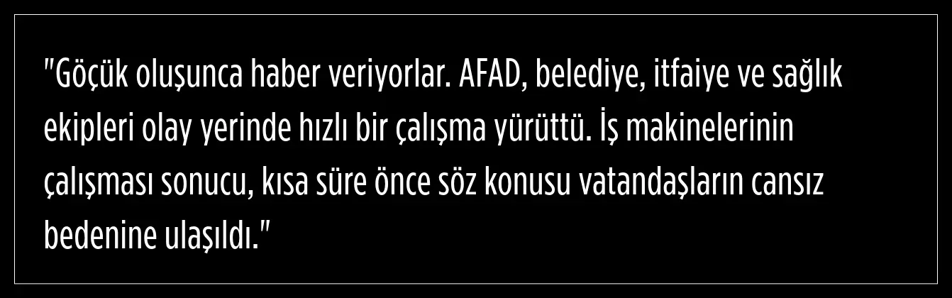 Olayın ihbarı üzerine Ulusal Medikal Kurtarma Ekibi (UMKE), İl Afet ve Acil Durum Müdürlüğü (AFAD), jandarma ve itfaiye ekipleri bölgeye yönlendirildi. Ekiplerin yoğun çalışmaları sonucunda Bayraktar ve Aydın'ın cansız bedenlerine ulaşıldı.