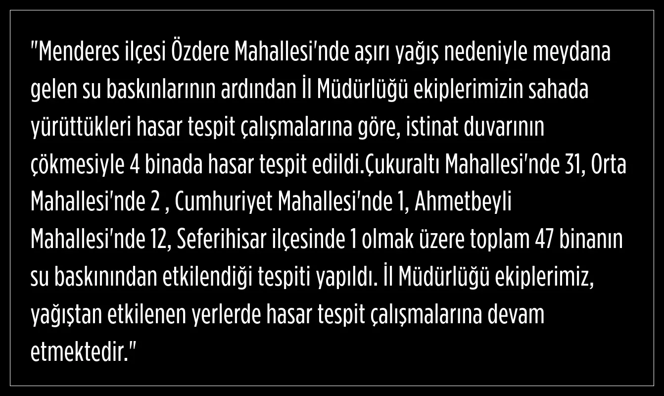 Çevre, Şehircilik ve İklim Değişikliği Bakanlığı, İzmir'in Menderes ilçesinde şiddetli sağanak nedeniyle istinat duvarının çökmesi sonucu 4 binada hasar oluştuğunu, şu ana kadar toplam 47 binanın su baskınından etkilendiğinin belirlendiğini açıkladı.