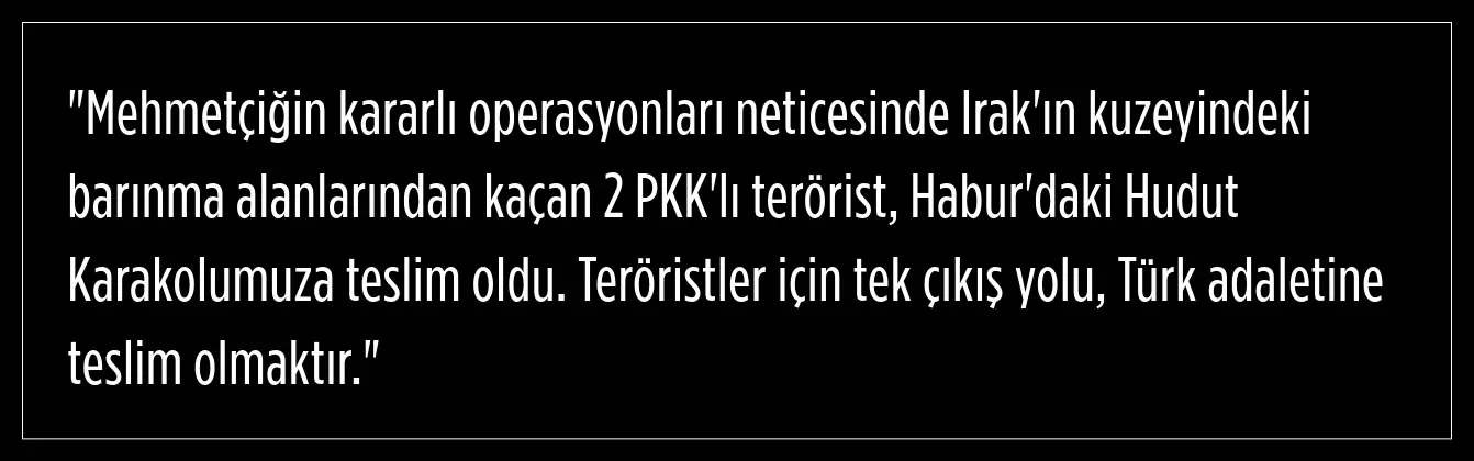 Irak'ın kuzeyindeki barınma alanlarından kaçan 2 PKK'lı terörist, Habur'daki Hudut Karakoluna teslim oldu.