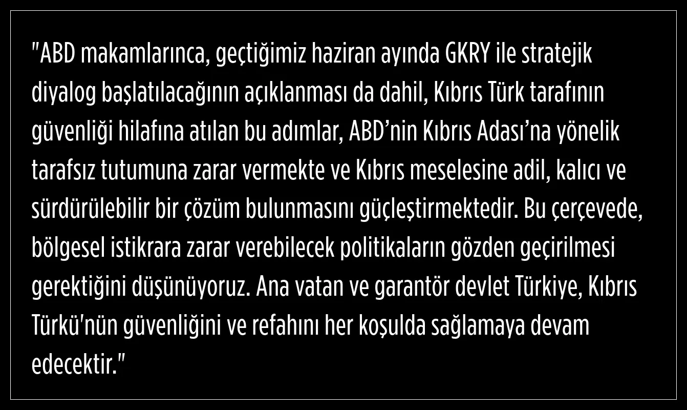Bölgesel istikrara zarar verebilecek politikaların gözden geçirilmesi gerektiği vurgulanan açıklamada, bu adımların, ABD’nin Kıbrıs Adası’na yönelik tarafsız tutumuna zarar verdiği uyarısı yapıldı.