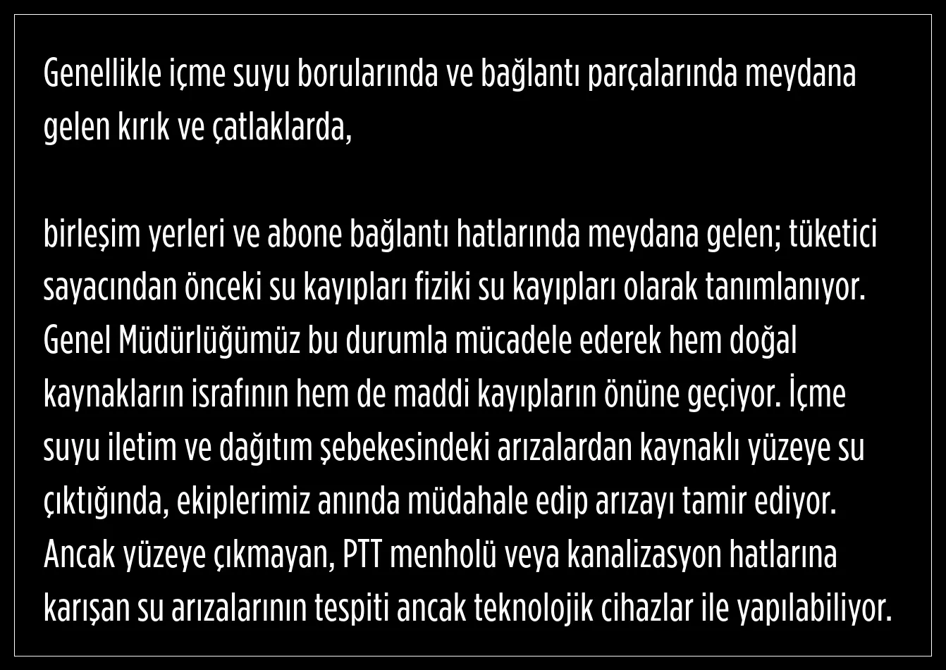Son teknoloji akustik sensörler, basınç sensörleri ve debimetrelerle yürütülen çalışmalar sayesinde, su arızaları yüzeye çıkmadan yer altında tespit edilerek su israfı önleniyor.