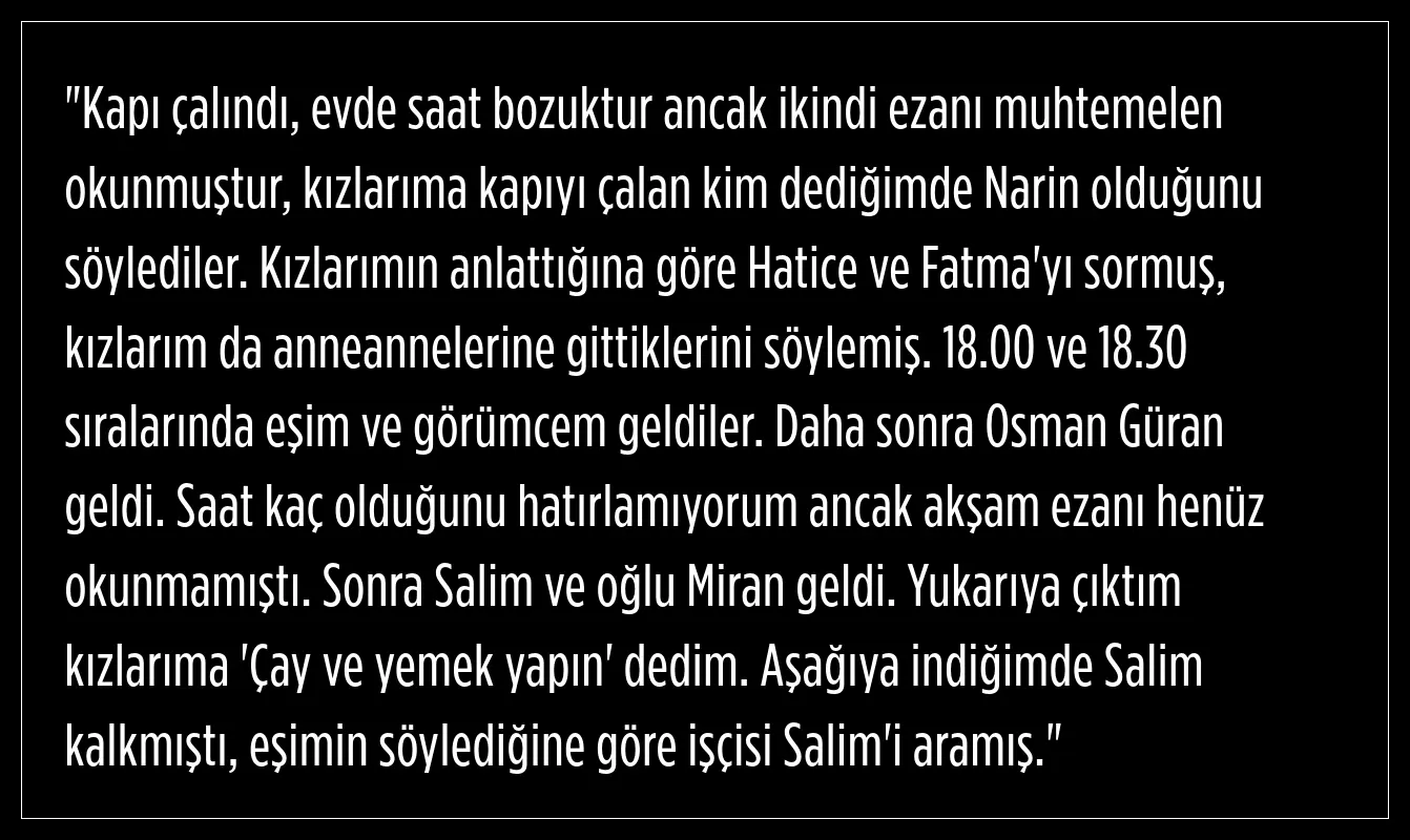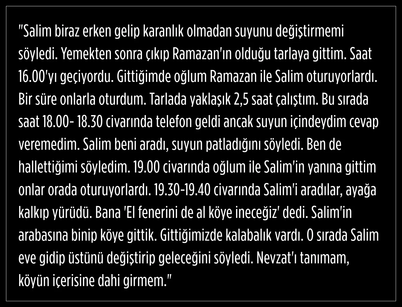 Ona inanarak o şekilde ifade verdim. Salim'in son günlerde söylenenlerle gerçek yüzünü öğrenince acaba saati hatırlamadım mı diye düşündüm, hatta bu konuyu Melike ve annem ile de konuştum. Her gün annem ve Melike ile bu saati konuşuyorduk.")