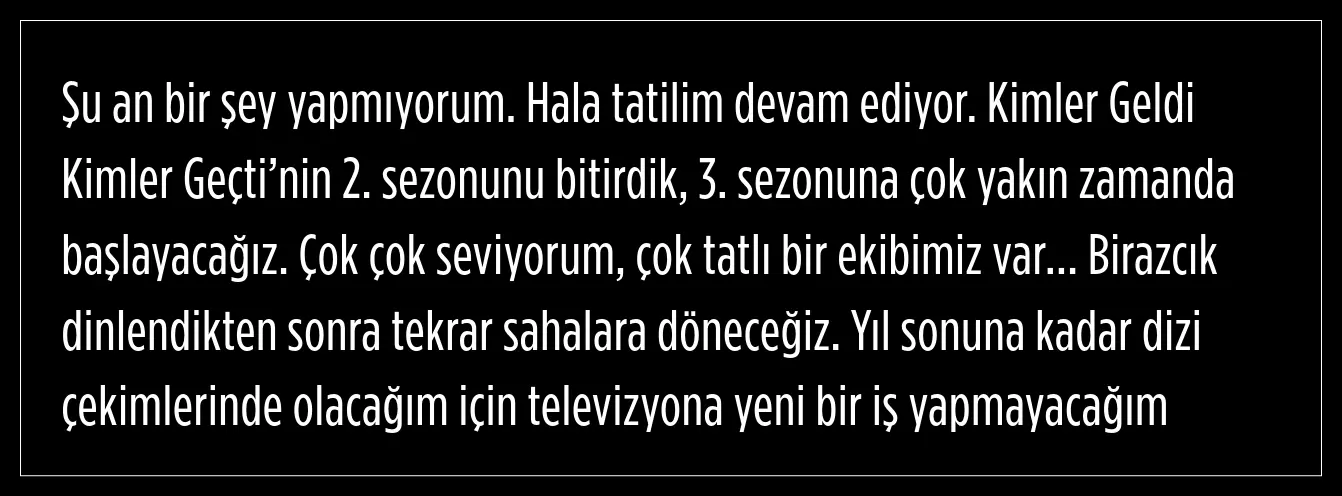 Oyuncu, yıl sonuna kadar dizi çekimlerinde olacak olmasından dolayı televizyona bir iş yapmayacağını ifade etti.