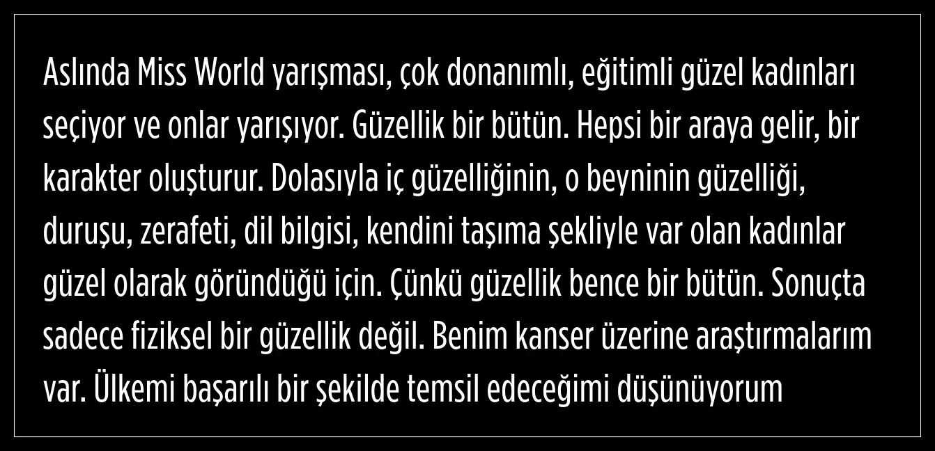 Ülkede çok yanlış bir algı olduğunu, güzellik yarışmasının sadece fiziksel görünümü kapsamadığını ifade etti.