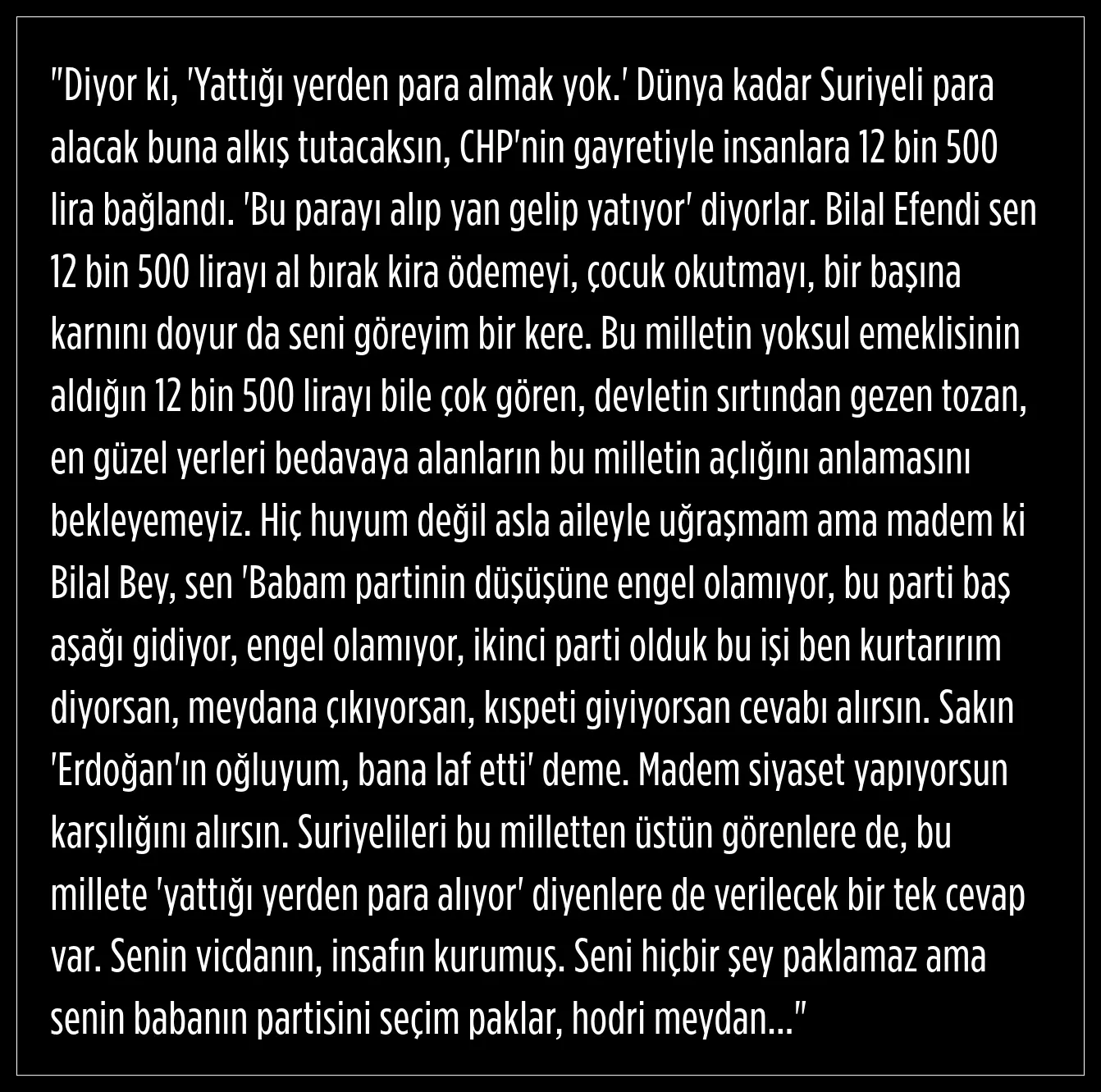 Bilal Erdoğan'ın konuşmasında kullandığı ifadelere değinen Özel, "Ona göre suç oranı bakımından Suriyeliler, Türklerden daha düşük. Suriyelilerin, 'uyumlu' olduğu fikrini savunuyor. Biz sizi de Suriyelileri de göndereceğiz. Ucuz iş gücüymüş! Sürekli suça bulaşan kişiler, sütten çıkmış ak kaşık olarak gösterilemez. Nasıl bir vicdan bu?" şeklinde konuştu.