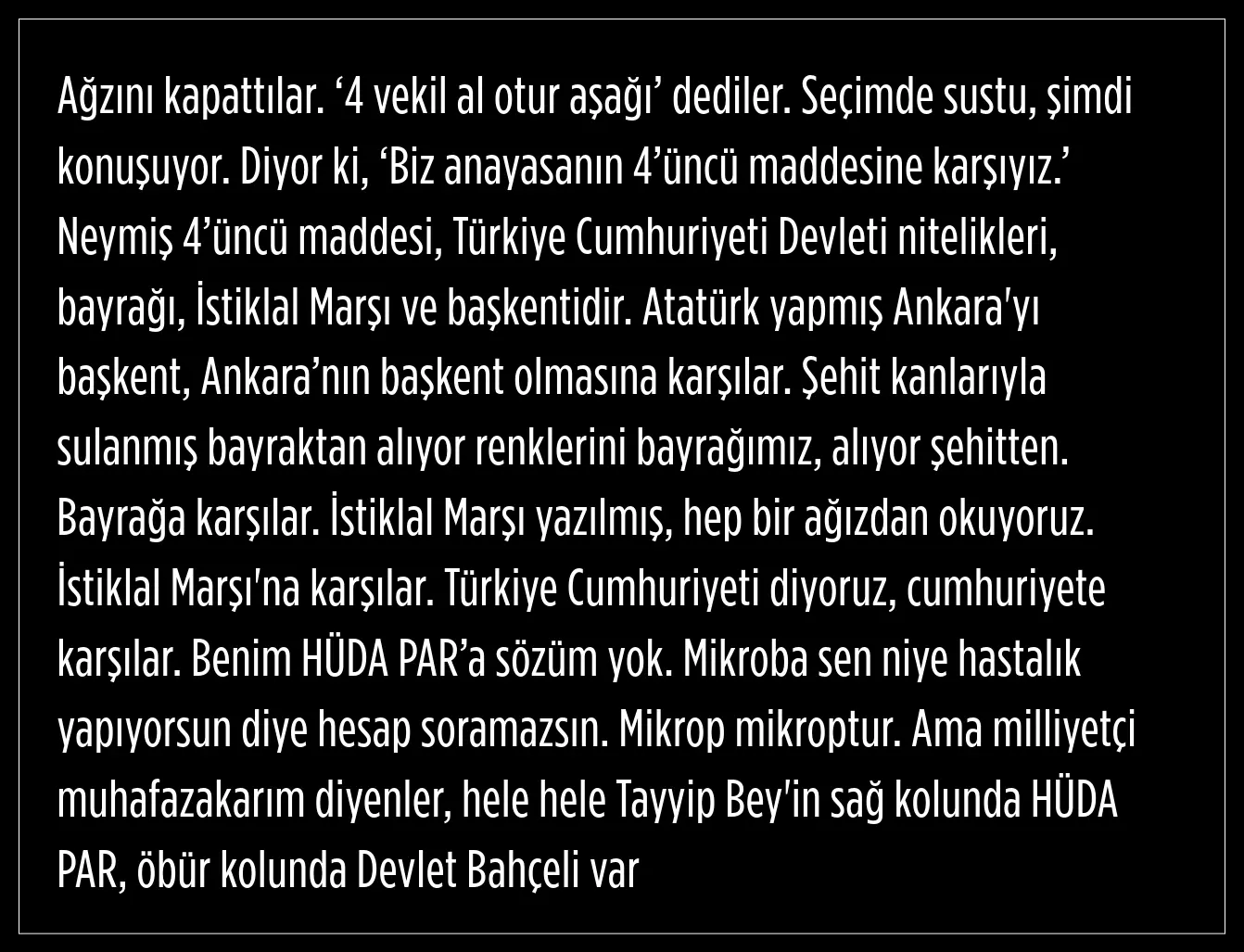 HÜDA PAR Genel Başkanı Zekeriya Yapıcıoğlu'nun "Anayasa'nın 4. maddesi olmasın" açıklaması siyasetin yeni tartışma gündemi oldu.