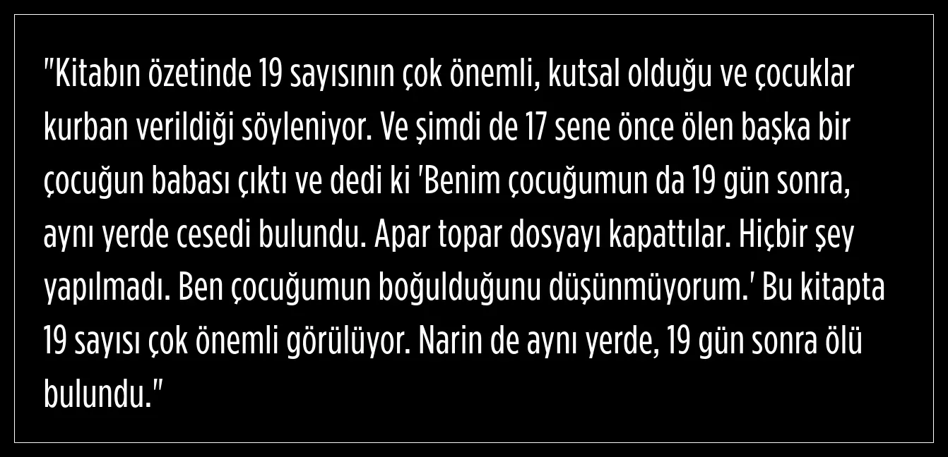 Narin’in ölüm şekli, son dönemde tartışma konusu olan ve Yahudi ritüellerine dayandığı iddia edilen "Tavşan Tepesi" adlı kitapla büyük benzerlikler taşıyor. Kitapta yer alan tavşanlarla yapılan ritüeller, Narin’in yaşadığı trajik son ile örtüşüyor.