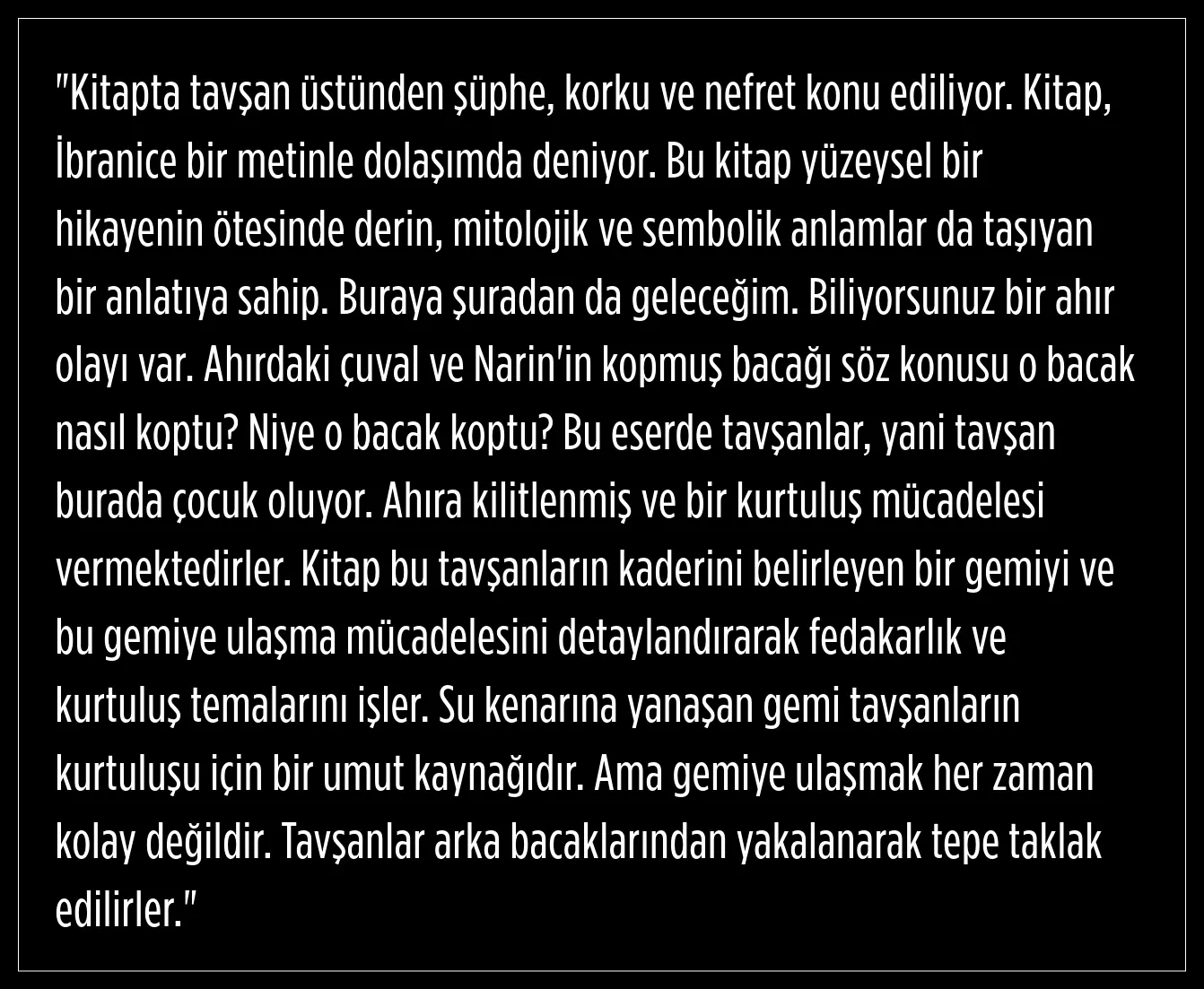 Narin'in kopmuş sol bacağının, kitaptaki hikayede tavşanların sol bacaklarından asılmasına bir gönderme olabileceği düşünülüyor. Hikayede tavşanlara 19'uncu günde kaçma fırsatı verilmesi, Narin'in cesedinin aramaların 19. gününde bulunmasıyla örtüşüyor.