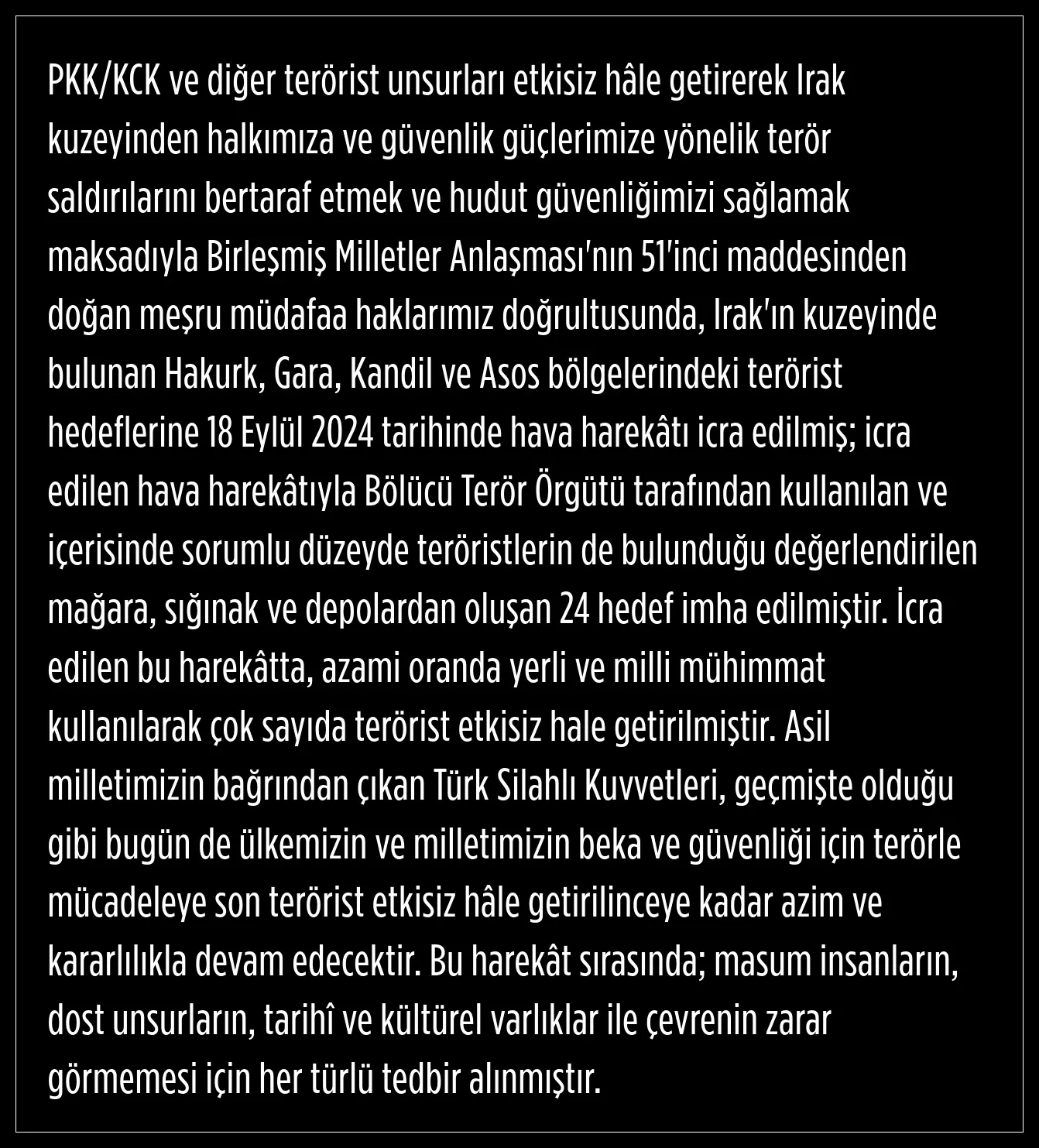 Türk Silahlı Kuvvetleri'nin (TSK) bölücü terör örgütüne yönelik operasyonlarına kararlılıkla devam ettiği vurgulandı. Hakurk, Gara, Kandil ve Asos bölgelerinde düzenlenen hava harekatında teröristlere ait mağara, sığınak ve mühimmat depolarının vurulduğu, toplam 24 hedefin başarılı bir şekilde imha edildiği belirtildi.