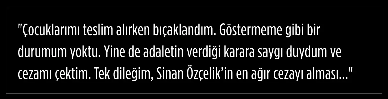 Sinem T., yaklaşık iki yıl önce 11 ve 13 yaşlarındaki kızlarının babası Sinan Özçelik'le şiddetli geçimsizlik sebebiyle boşandı. Boşanmanın ardından, Sinan Özçelik, 24 Ekim 2022'de çocuklarını teslim etmek için buluştuğu eski eşini bıçakladı. Olayda 7 yerinden bıçaklanan Sinem T., 10 gün boyunca yoğun bakımda kaldı ve tedavisinin ardından sağlığına kavuştu. 'Kasten öldürmeye teşebbüs' suçundan tutuklanan Sinan Özçelik, olaydan 9 ay sonra tahliye edilse de itirazlar üzerine tekrar tutuklandı.