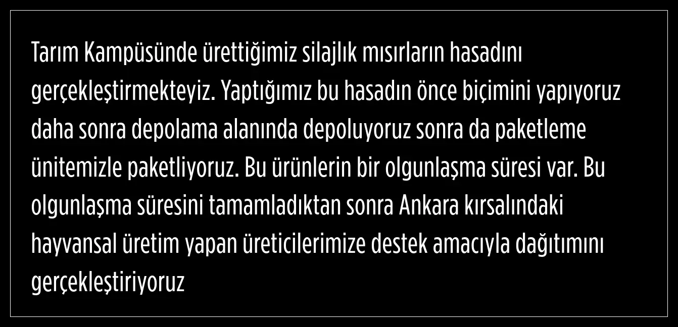 BAKAP’ta, 130 dönümlük arazide ekimi yapılan silajlık mısır hasadı ve silaj paketleme işlemleri hızla devam ediyor. Bu destek programı çerçevesinde, elde edilen kaliteli kaba yem, Ankara’da hayvan yetiştiriciliği yapan küçük aile işletmelerine ücretsiz olarak dağıtılacak. Böylece hayvancılık yapan yerel üreticilere büyük bir katkı sağlanarak kırsal ekonominin desteklenmesi hedefleniyor.