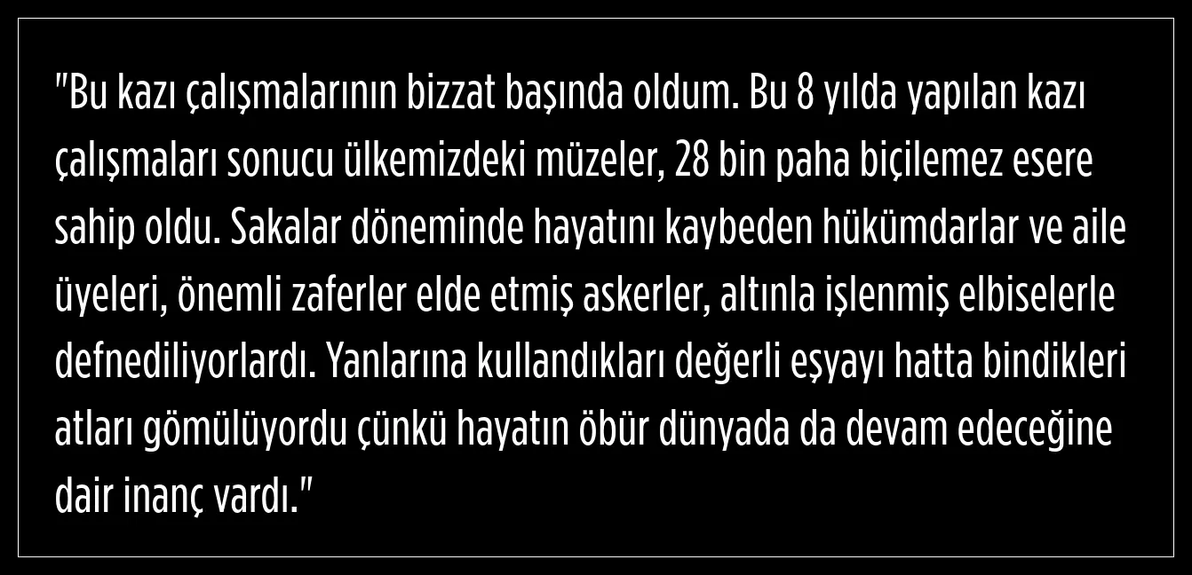 Kazakistan’ın doğusundaki Altay Dağları bölgesinde yapılan arkeolojik kazılar sürüyor. Sakalar (İskitler) dönemine ait olduğu belirlenen yaklaşık 3 bin yıllık altın eserler, başkent Astana'da ziyaretçilerin beğenisine sunuluyor.