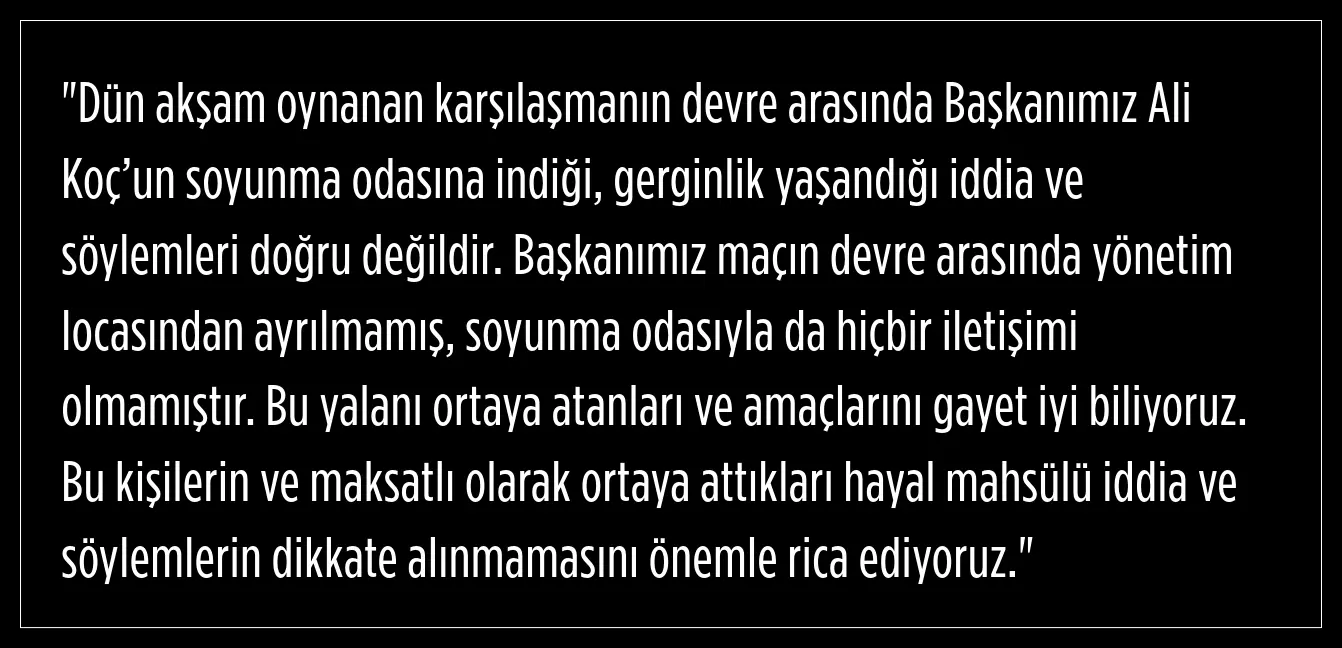 Fenerbahçe Kulübü, Ali Koç'un soyunma odasına indiğine yönelik iddialar hakkında şu açıklamada bulundu: