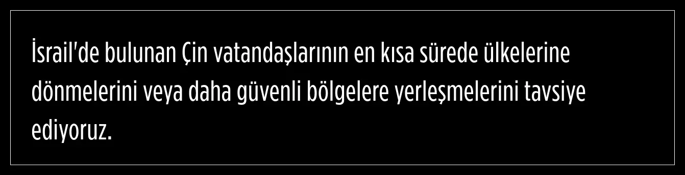 Çin, İsrail'de bulunan vatandaşlarına uyarıda bulundu ve söz konusu ülkeyi derhal terk etmelerini istedi.