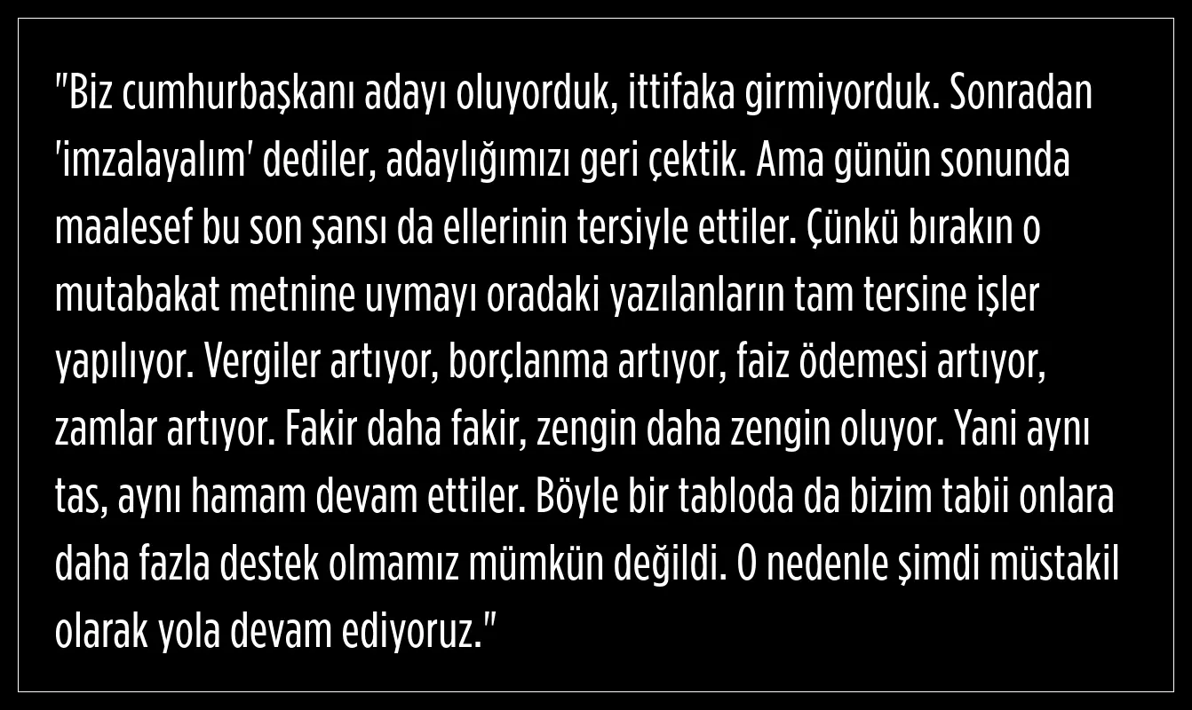AK Parti ile birliktelik ihtimalinin olmadığını belirten Erbakan, "Biz çok samimi yaklaştık ve fedakarlıklar yaptık. Halkın huzurunda bir mutabaat imzalandı. Buna asla uyulmadı. Bu durum, bizim güvenimizi sarstı. Tüm bunlardan dolayı artık birliktelik ihtimalimiz yok." dedi.