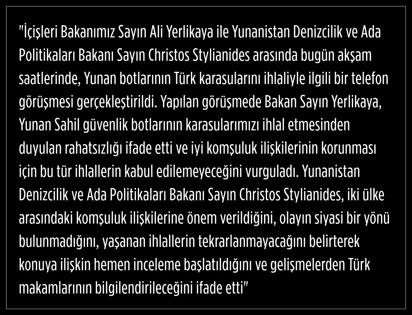 Bakanlık, Yerlikaya ve Stylianides’in bugün akşam saatlerinde telefonda Yunan botlarının Türk karasularını ihlaliyle ilgili bir telefon görüşmesi gerçekleştirdiklerini duyurdu.