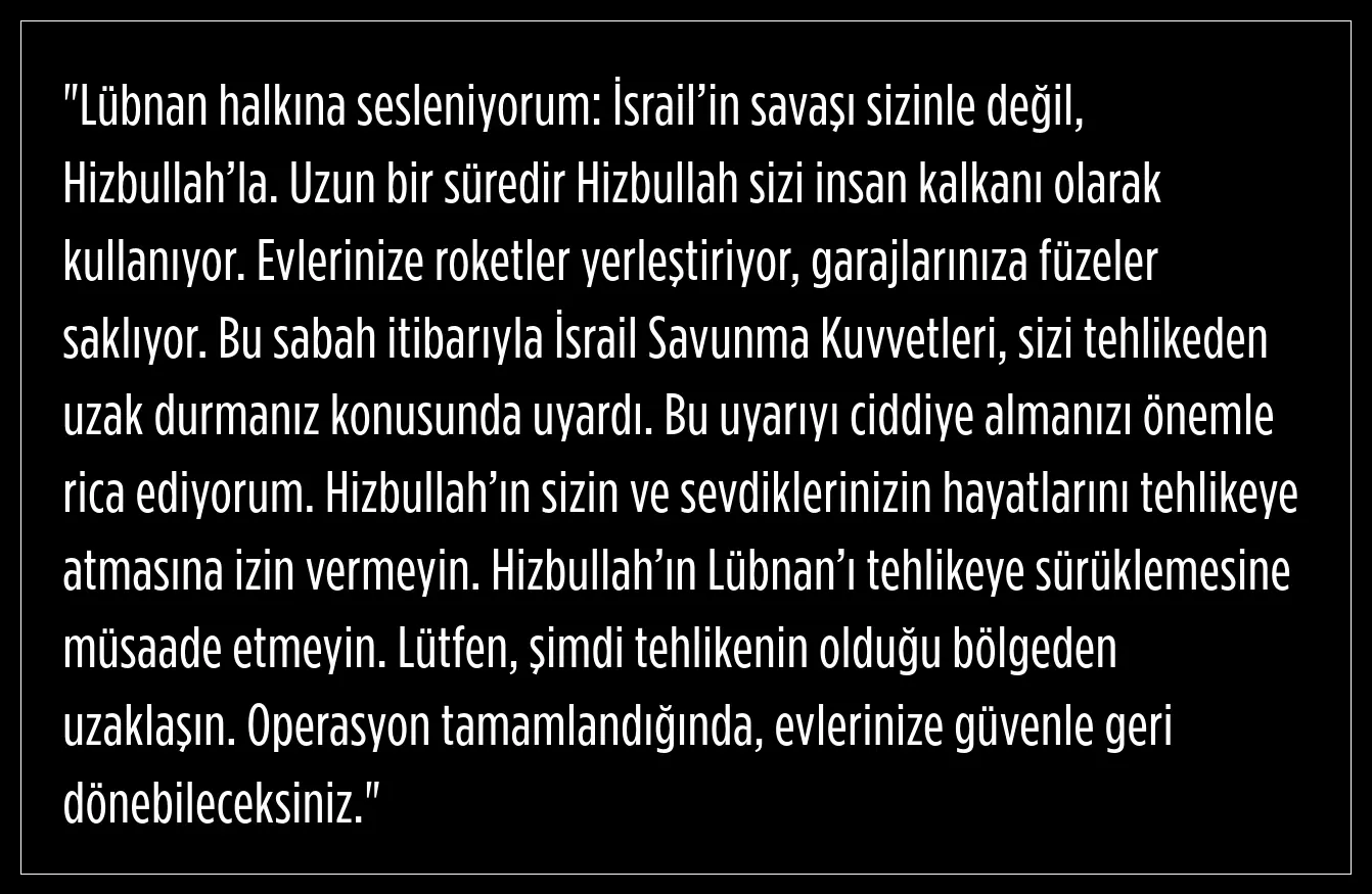 Netanyahu, Lübnan'daki sivillere hitaben yaptığı açıklamada, İsrail'in savaşının Lübnan halkıyla değil, Hizbullah ile olduğunu vurguladı. Söz konusu isim, şu ifadeleri kullandı: