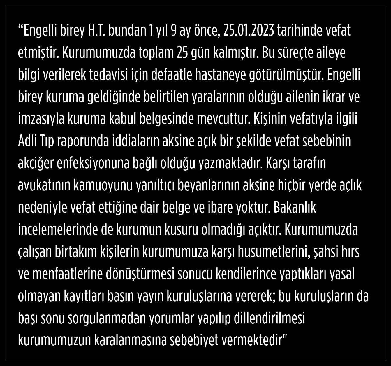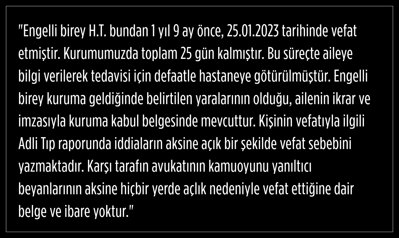 Geçtiğimiz yıl Ocak ayında aynı bakım merkezinde destek alan 17 yaşındaki H.T.'nin açlıktan öldüğü iddialarına da Özel bakım merkezi avukatı Beytullah Duymaz şöyle yanıt verdi: