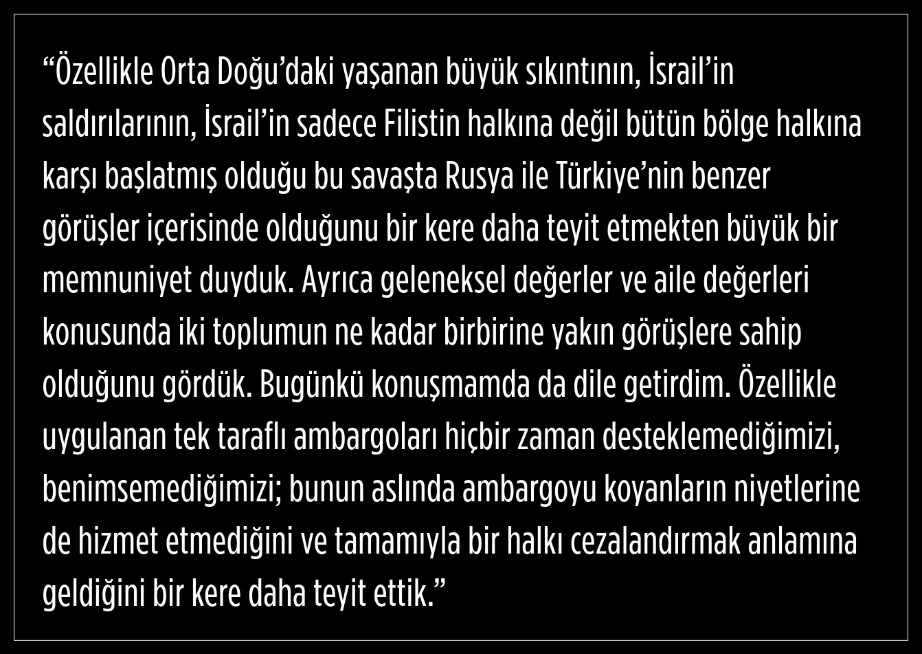 İsrail’in sadece Filistin halkına değil bütün bölge halkına karşı savaş başlattığını belirten Putin, bu savaşa ilişkin Rusya ile Türkiye’nin benzer görüşler içerisinde olduğunu dile getirdi.