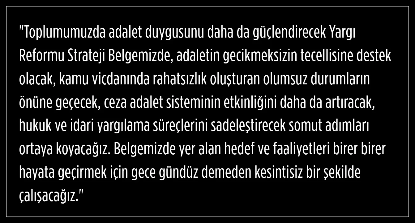 Adalet Bakanı Yılmaz Tunç, Yargı Reformu Strateji Belgesi'ni, hukukun üstünlüğünü esas alan, gecikmeyen, öngörülebilir adalet sistemi vizyonuyla hazırladıklarını vurguladı.