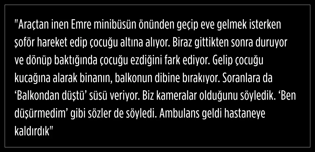 Kara, binanın görevlisinin telefon açıp 'Çocuğun düşmüş, ambulansa attık götürüyoruz, bilginiz olsun hastaneye gelin' dediğini aktardı.