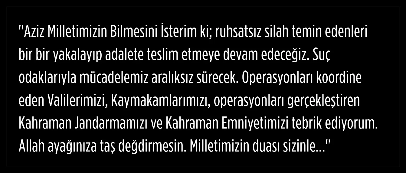 Operasyonlar sonucunda; Bin 271 tabanca, 534 kurusıkıdan çevrilmiş tabanca, 43 uzun namlulu tüfek, 663 ruhsatsız av tüfeği olmak üzere 2 bin 511 silah ele geçirildi.