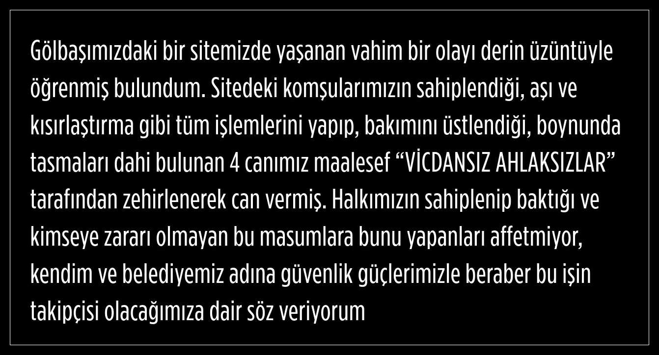 Sokak hayvanlarının tartışma gündemi olduğu şu günlerde Gölbaşı Belediye Başkanı Yakup Odabaşı ilçede yaşanan vahim bir olayı açıkladı.