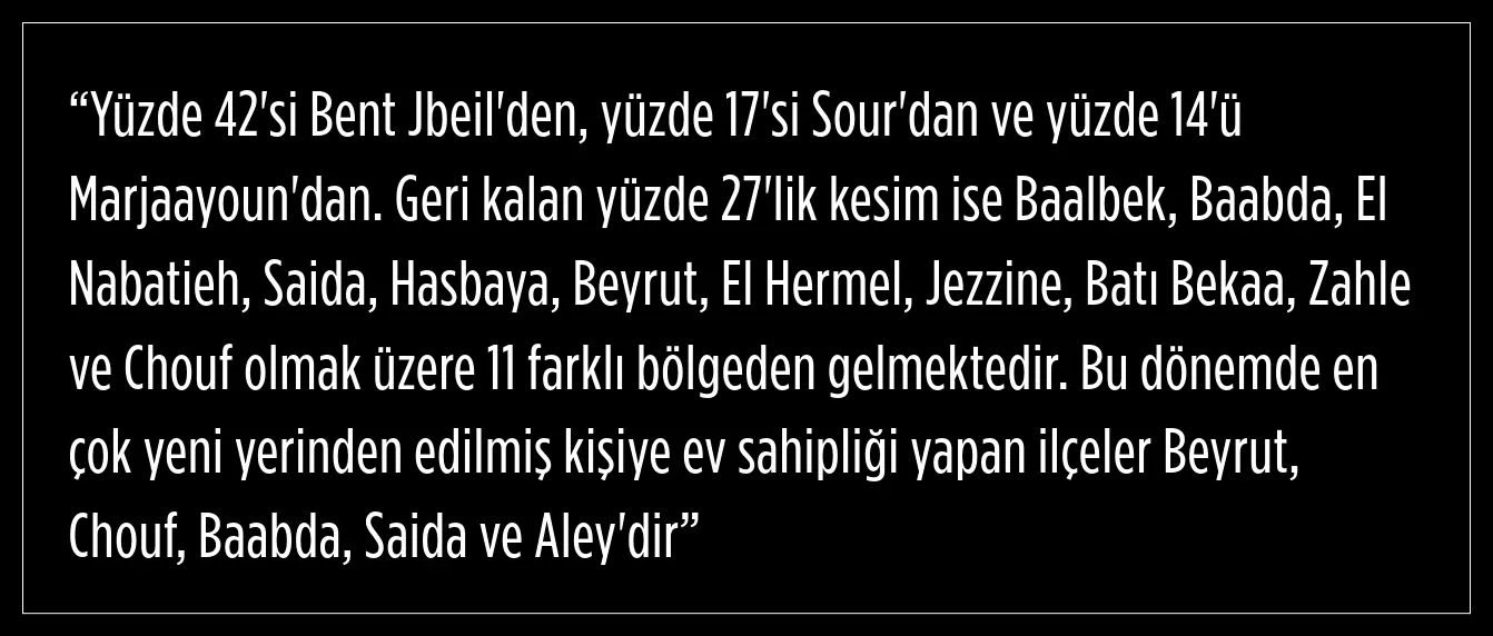 Lübnan'da yerinden edilmiş kişilerin yüzde 73'ü Lübnan'ın güney sınırındaki 3 bölgeden göç etti.