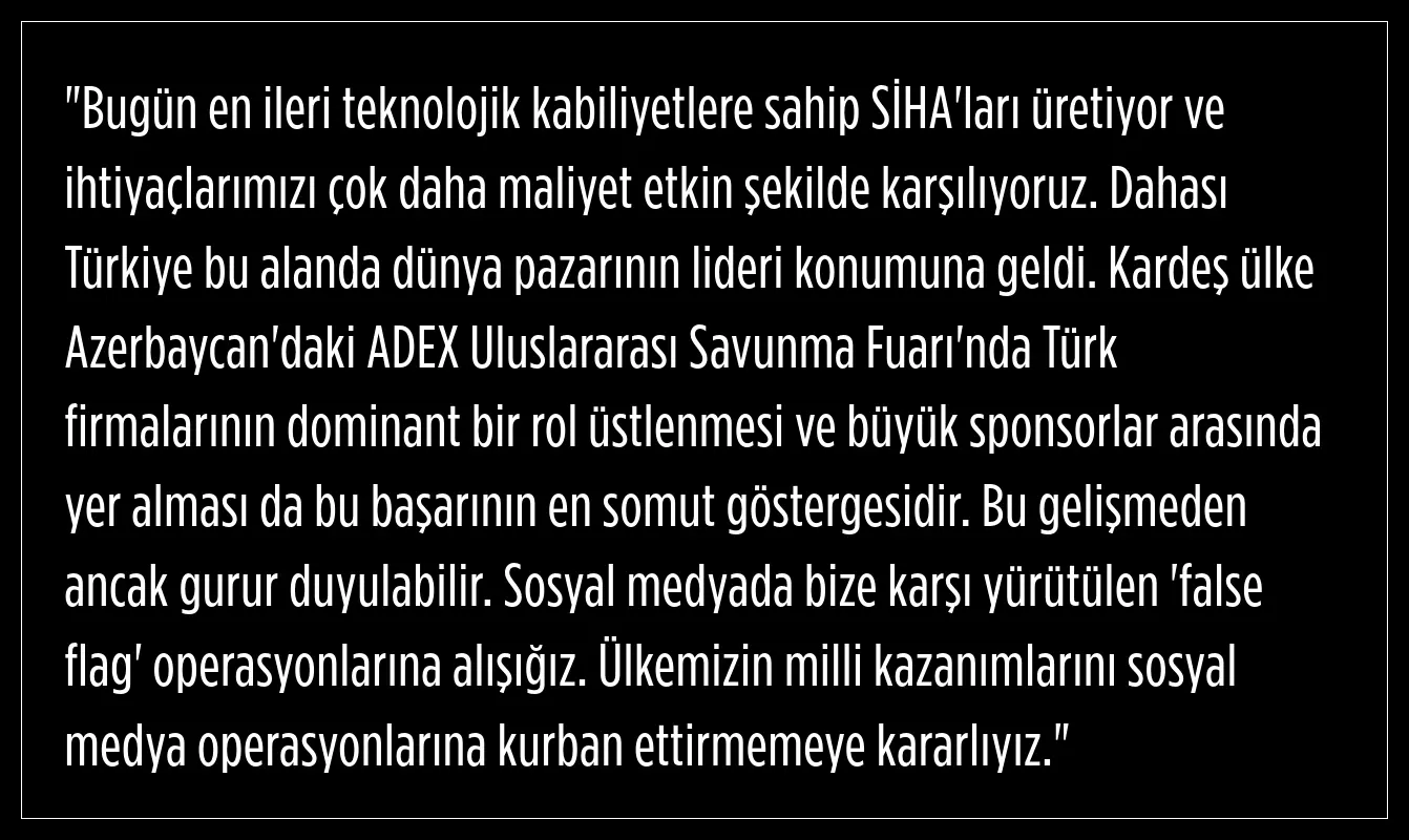 "Sosyal medyada bize karşı yürütülen 'false flag' operasyonlarına alışığız” diyen Bayraktar sosyal medya hesabından yaptığı açıklamada, Türkiye’nin milli kazanımlarını sosyal medya operasyonlarına kurban ettirmemeye kararlı olduklarını vurguladı.
