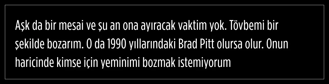 İrem Derici, aşk da mesaisinin ve ayıracak zamanının olmadığını ifade ederek, tövbesini yalnızca 1990 yıllarındaki Brad Pitt olursa bozacağını söyledi.