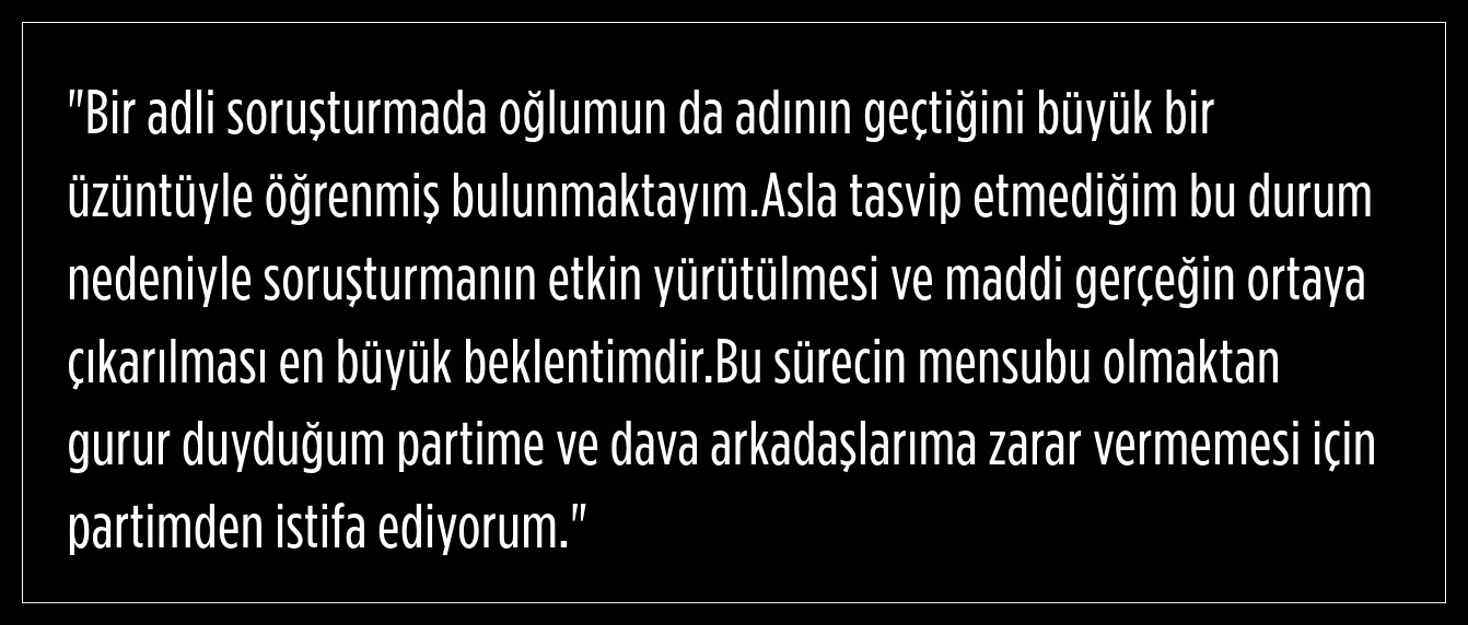 AK Parti Adana Milletvekili Ahmet Zenbilci, oğlunun adının bir soruşturmada geçmesi üzerine partisinden istifa ettiğini duyurdu.