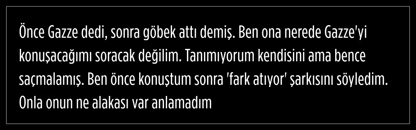 Sinan Akçıl ve Tuba Ünsal arasında gerginlik yaşandı. Ünsal, Akçıl'ın Gazze ile ilgili konuşmasının ardından şarkı söylemesine tepki gösterdi.