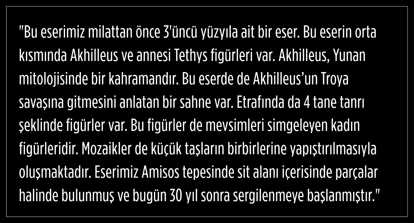 Samsun Müzesi’nde görev yapan arkeolog Samet Armağan, mozaiğin Samsun'da yapılan bir yol çalışması sırasında bulunduğunu belirterek, "Bu eser 30 yıl boyunca müzemizin deposunda korunaklı bir şekilde muhafaza edildi. Mart ayında açılan yeni Samsun Müzesi ile birlikte halkımızın beğenisine sunuldu" dedi.