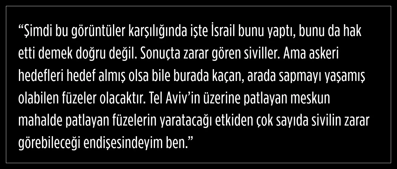 İsrail’in Uluslararası Ceza Mahkemesi’nde soykırım suçlamasıyla sanık sandalyesinde hesap verdiği unutmuşa benzeyen Yeşiltepe, ‘askeri hedefleri bile hedeflese ya arada kaçan İsrail’i vuran füze olursa ne olacak?’ diye endişeliydi.