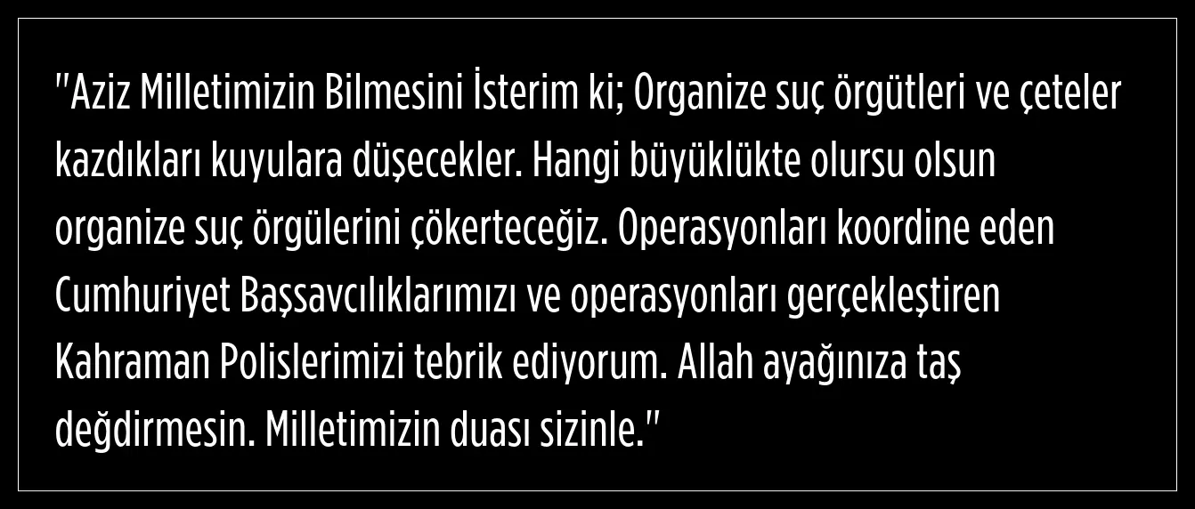 Soma ve Yozgat Cumhuriyet Başsavcılıklarımız ile Emniyet Genel Müdürlüğü KOM Başkanlığı koordinesinde; Manisa ve Yozgat İl Emniyet Müdürlüğü KOM Şube Müdürlüklerince yapılan çalışmalar sonucu; Manisa ve Yozgat merkezli Trabzon, Tekirdağ ve Hatay’da düzenlenen operasyonlarda organize suç örgütü üyesi şüphelilerin;