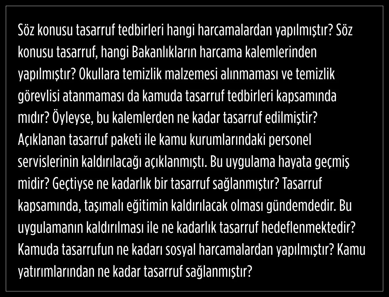 CHP'li Ateş, Hazine ve Maliye Bakanı Şimşek'e yönelik bir soru önergesi vererek, tasarruf tedbirleri doğrultusunda yapılan harcamaların detaylarını ve eğitim alanında uygulanan önlemleri sorguladı.