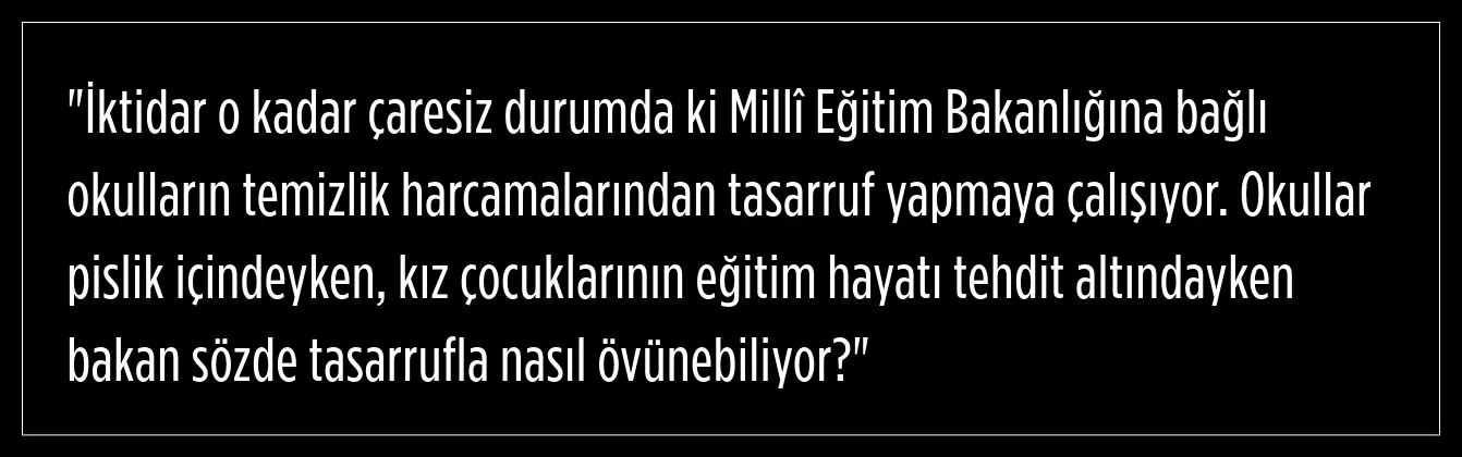 Hükümetin tasarruf anlayışını eleştiren Ateş, özellikle Millî Eğitim Bakanlığına bağlı okulların temizlik harcamalarından yapılan kesintilere dikkat çekerek, şu ifadeleri kullandı:
