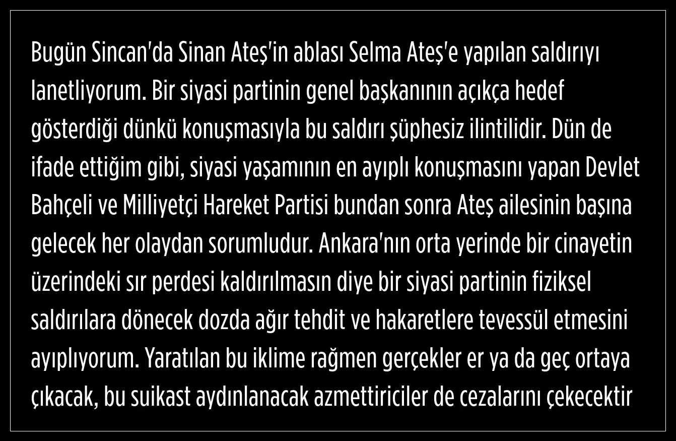 CHP Lideri, Devlet Bahçeli ve Milliyetçi Hareket Partisi'nin bundan sonra Ateş ailesinin başına gelecek her olaydan sorumlu olduğunu belirtti.