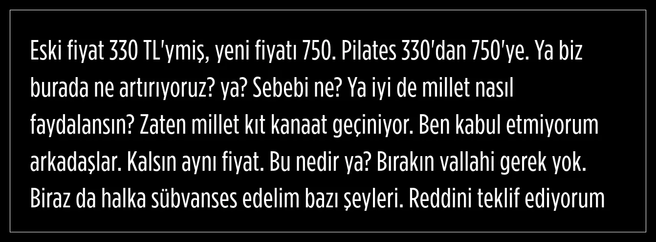 Belediye başkanı, fiyat artışlarını saydığı sırada artışları kabul etmediğini söyleyerek, aynı fiyat kalması gerektiğini söyledi.