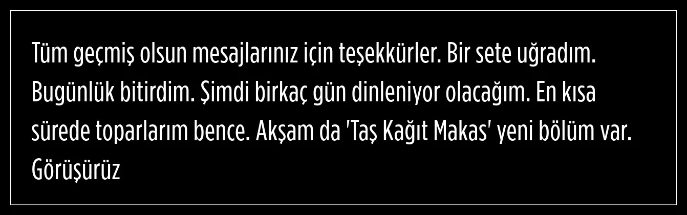 Doğandemir, Taş Kağıt Makas dizisinin setinden kendi fotoğrafını paylaşarak, sağlık durumuna ilişkin bilgilendirmede bulundu.