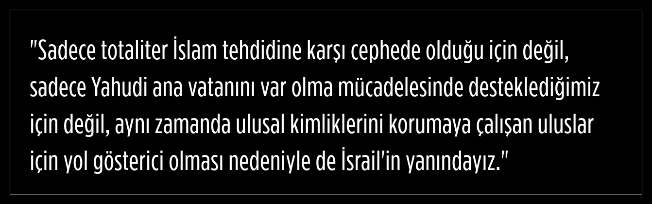 Wilders, "Avrupalı Milliyetçiler Neden İsrail'i Desteklemeli?" başlıklı makalesinde , İsrail'in düşmanlarının kötü olduğunu ve kötülük karşısında tarafsızlığın da kötü olduğunu belirterek "İsrail'in yanındayız" dedi.